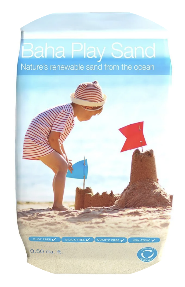 Our play sand is Baha Play Sand, made by Calcean, and sustainably sourced from the Bahamas. Unlike “regular” sand, it’s 100% silica-free and quartz-free, which means it’s safe for indoor play and gentle on kids’ skin and lungs. The grains are smooth and round, so they don’t hard-pack, and they stay naturally cool and comfortable for endless digging, building, and creating.